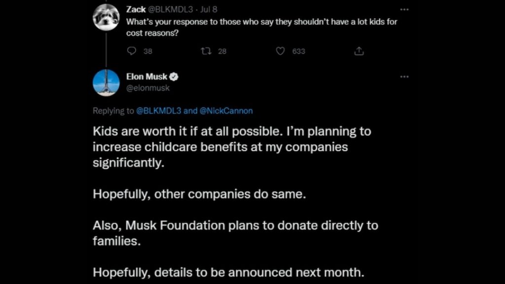 Currently, the exact details of the childcare benefits remain unclear. Musk says that details will be announced next month. Last week, the Tesla CEO claimed that he’s doing his “best to help the underpopulation crisis.” He had also said, “A collapsing birth rate is the biggest danger civilization faces by far.”